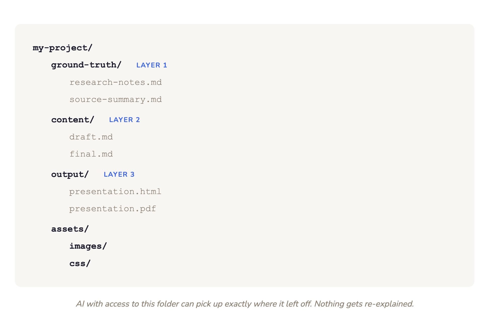 The AI that helped synthesize sources in Layer 1 can pick up where it left off in Layer 2. The content feeds directly into Layer 3. Nothing gets re-explained. The folder becomes the shared memory.