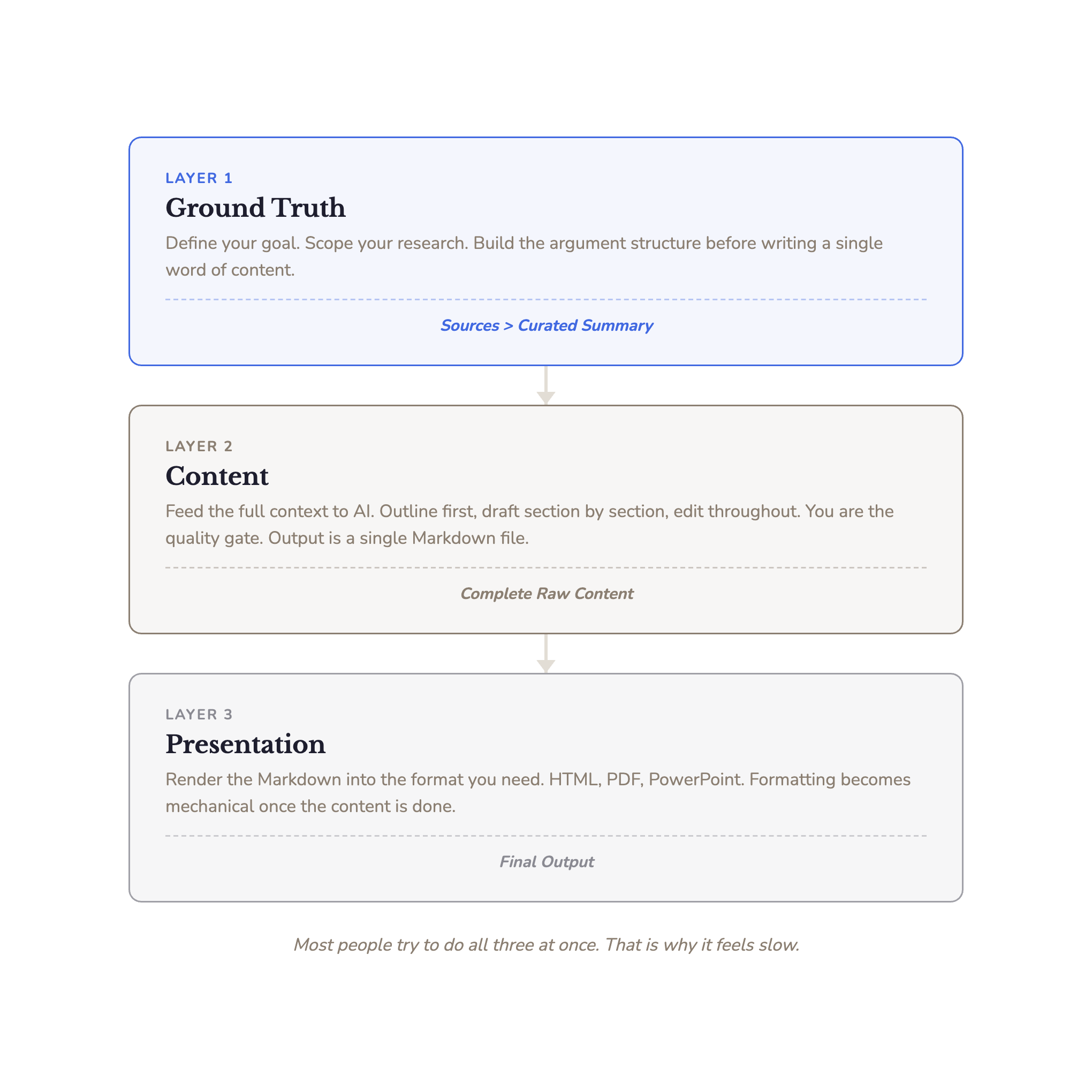 Separate those layers and everything gets easier. Not just for slides, but for any kind of knowledge work: strategy reports, newsletters, research documents.