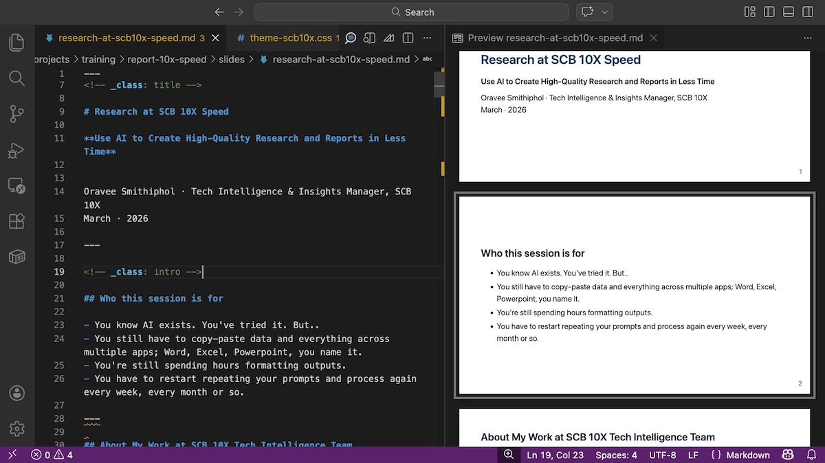 My work involves presentations, reports, and notes regularly. I wanted to spend more time thinking clearly and less time fighting formatting, so I changed my pipeline. It worked well enough that I was asked to run a training for SCB 10X and SCBX R&D this month.